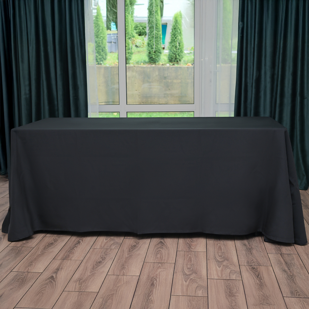 Скатерть прямоугольная черная, размер: 330х225 см в аренду для торжественных мероприятий. Эти скатерти специально созданы для широких прямоугольных столов, обеспечивая идеальную посадку благодаря своему увеличенному размеру. Они полностью скрывают столешницу и ножки, создавая аккуратный и элегантный вид. Идеально сочетаясь со стандартными размерами 180×80 см, они добавляют великолепие и стиль любому интерьеру. Изготовлены из матового материала «Профлайн», который отличается долговечностью и легкостью в уходе, делая каждое мероприятие особенным.