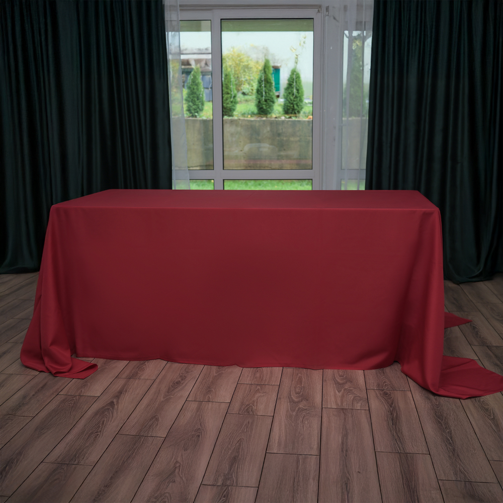 Скатерть прямоугольная красная, размер: 330х225 см в аренду для торжественных мероприятий. Эти скатерти специально созданы для широких прямоугольных столов, обеспечивая идеальную посадку благодаря своему увеличенному размеру. Они полностью скрывают столешницу и ножки, создавая аккуратный и элегантный вид. Идеально сочетаясь со стандартными размерами 180×80 см, они добавляют великолепие и стиль любому интерьеру. Изготовлены из матового материала «Профлайн», который отличается долговечностью и легкостью в уходе, делая каждое мероприятие особенным.