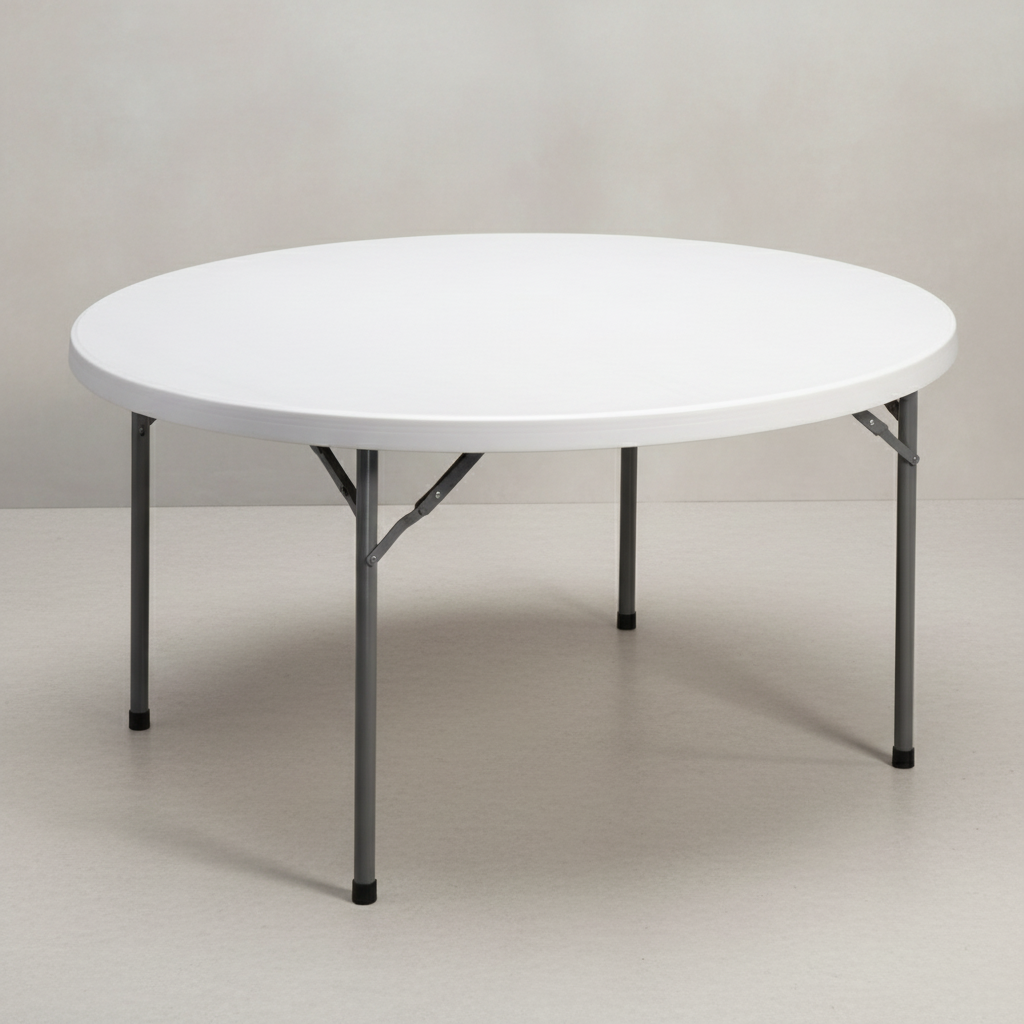 Аренда круглого складного стола — комфортное решение для размещения 10-12 человек. Стол выполнен с складным механизмом типа «дельта». Поверхность столешницы сделана из пластика толщиной 16 мм, по краям закреплена пластиковая кромка. Ножки и каркас изготовлены из стальных трубок диаметром 25 мм и покрыты черной порошковой краской.