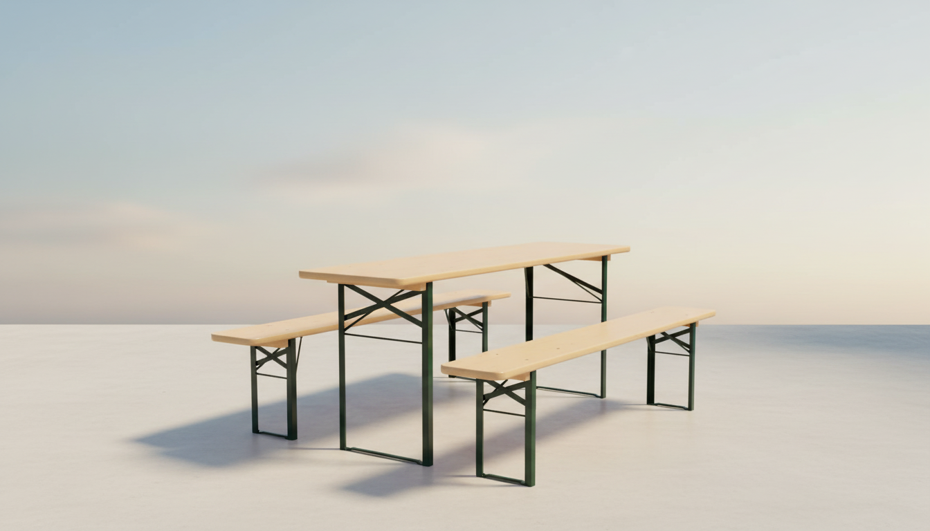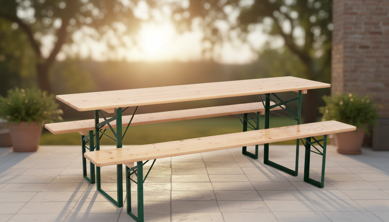 Прямоугольный стол со складными ножками размером 220х50 см с деревянной столешницей — отличный выбор для использования на свежем воздухе.