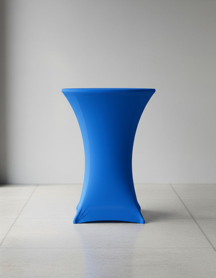 Темно-синий стрейч-чехол придает столику современный и элегантный вид. Чехол плотно облегает поверхность, гармонично сочетаясь с окружающим интерьером и подчеркивая стильность вашего мероприятия.